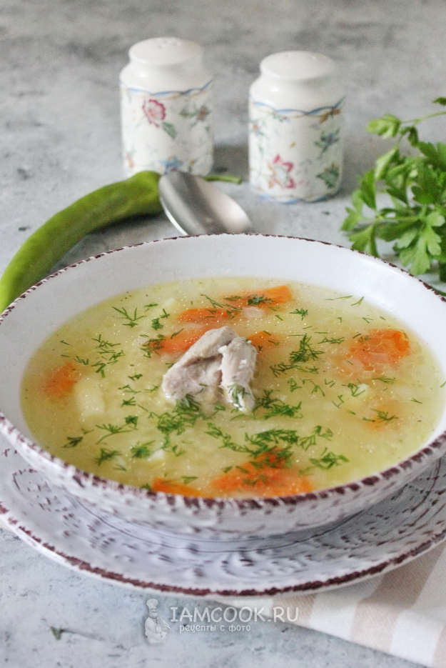 Суп из бедра индейки готов. При подаче выложите в тарелку кусочек отварной индейки.