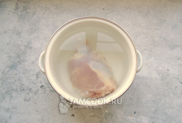 В кастрюлю выложите бедро индейки и залейте водой. На 500 г индейки потребуется 2 литра воды.