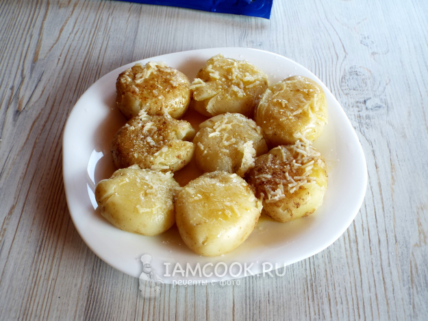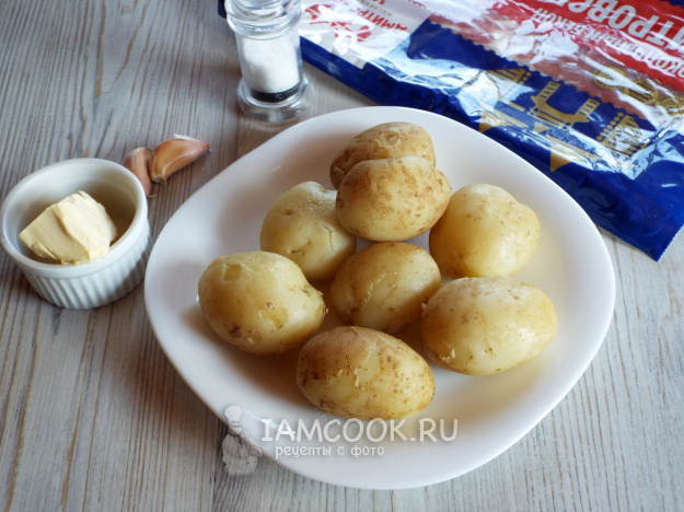 Чистый картофель надо отварить (прямо в шкурке). Я варила в микроволновке, в пакете, в течение 4 минут.