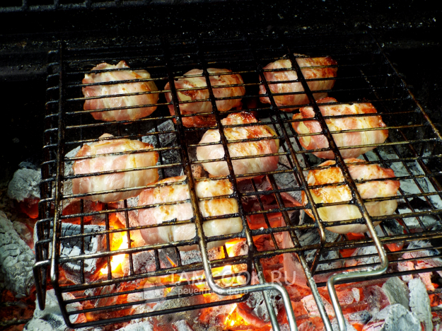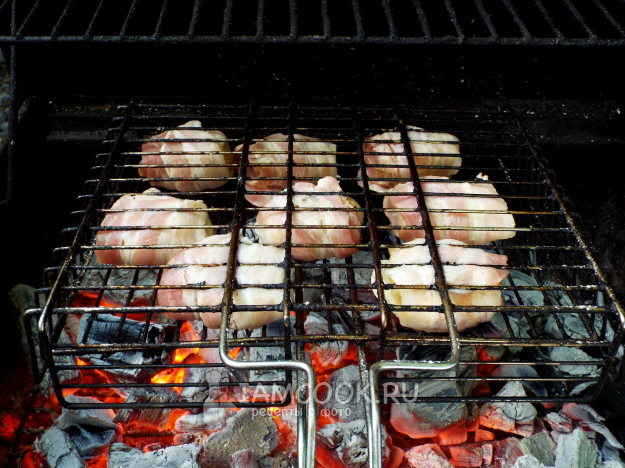 Жарить картошку с беконом на мангале на закрытой решётке, огонь умеренный.