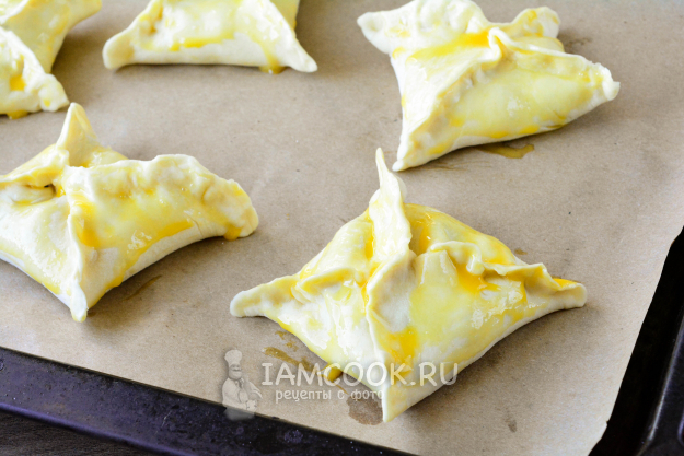 Слойки переложите на противень, выстеленный пекарской бумагой, смажьте изделия взбитым яйцом и отправьте в разогретую до 200°С духовку.