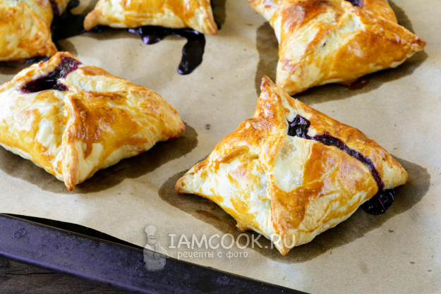 Выпекайте пирожки из слоеного теста с голубикой 15-18 минут до румяной корочки. Если вытечет немного сока из ягод - не страшно.
