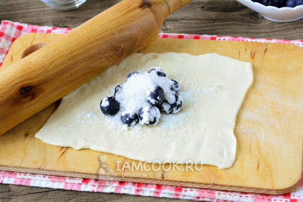 В центр теста выложите немного ягод голубики и добавьте сахар по вкусу.