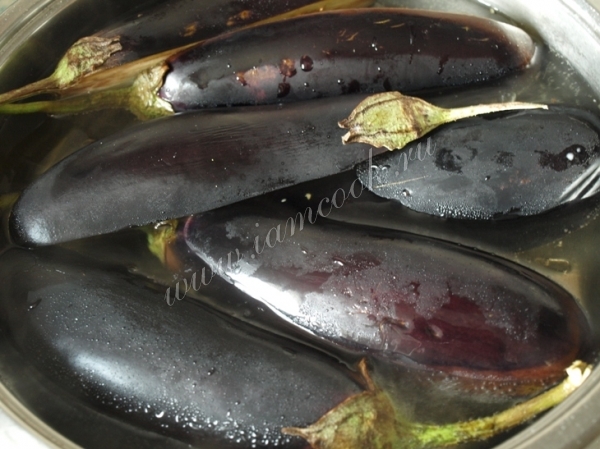 Опустить половинки в горячую воду, с момента закипания варить 10-15 минут. Затем выложить на дуршлаг и остудить. Из остывших баклажанов вынуть мякоть.