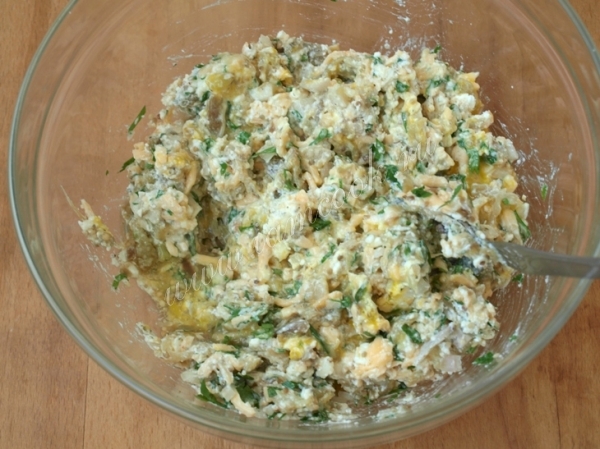 Для начинки домашний творог размять вилкой, добавить натёртый твёрдый сыр. Мелко нарезать петрушку, кубиками репчатый лук и измельчить баклажанную мякоть. Всё хорошо перемешать, вбить яйцо, посолить, приправить майораном и чёрным перцем. Выдавить чеснок.