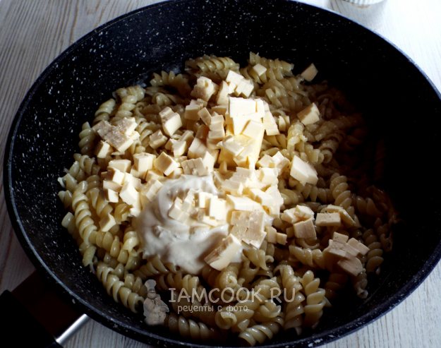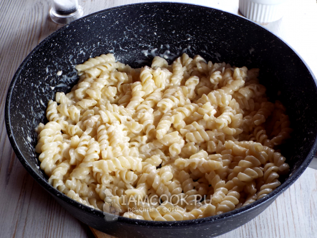 Добавить в сковороду с макаронами сыр, сметану и масло. Посолить по вкусу.
