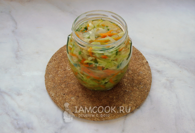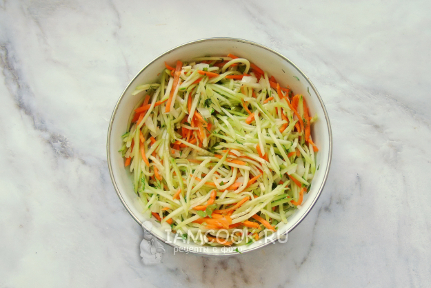 В приготовленную овощную смесь налейте уксус, посолите и перемешайте. Оставьте на 2 часа.
