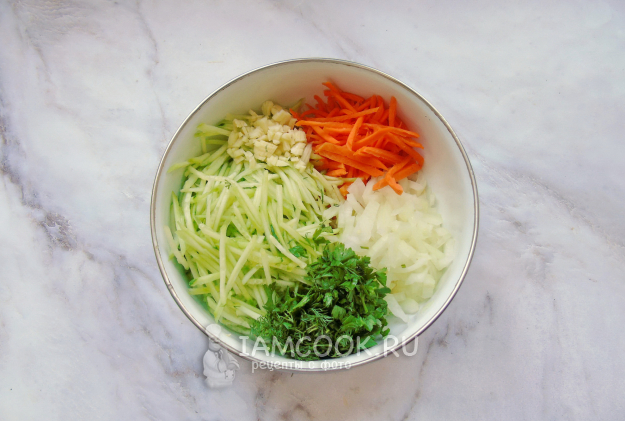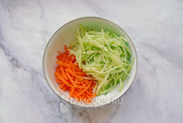 Огурцы и морковь помойте, очистите и натрите на терке. Я это сделала с помощью терки для моркови по-корейски.