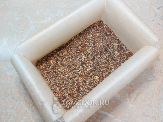 В подготовленную форму выложить основу. Равномерно распределить и очень хорошо утрамбовать стаканом с плоским дном или столовой ложкой.