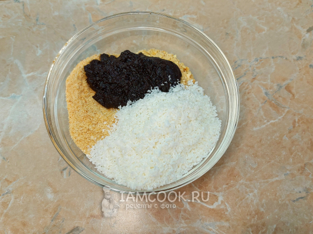В удобной миске смешать печенье, орехи, кокосовую стружку и шоколадно-сливочную массу. Перемешивать руками до полного объединения. По консистенции масса должна быть похожа на мокрый песок.
