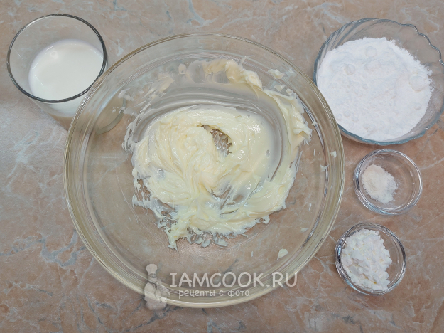 Добавить крахмал, ванилин, молоко и сахарную пудру, перемешать.