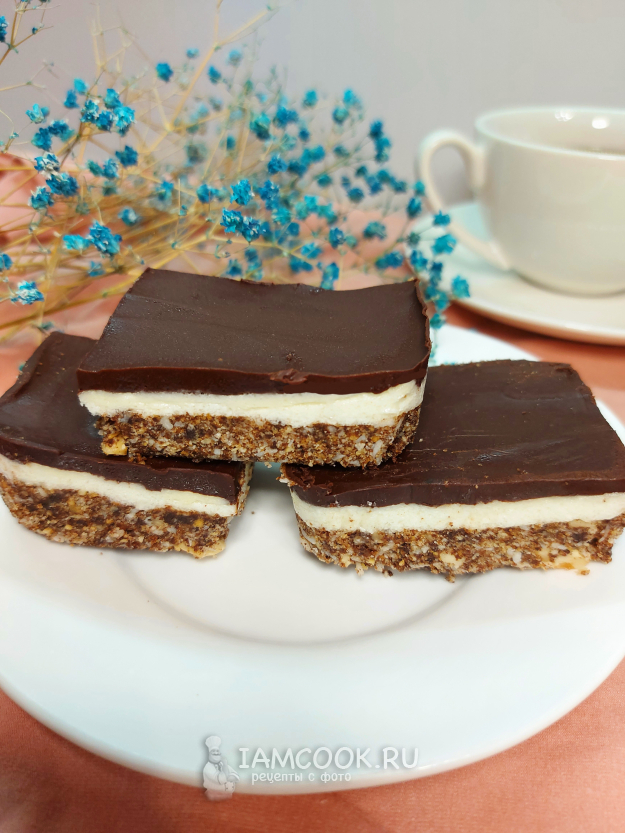 Аккуратно достать десерт Нанаимо из формы и нарезать на порционные кусочки горячим ножом.