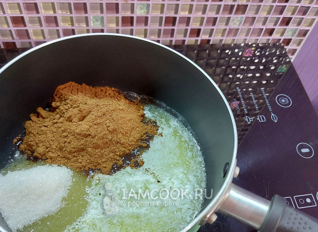 К маслу добавить сахар и какао, перемешать и прогреть около минуты до полного растворения сахара.
