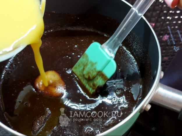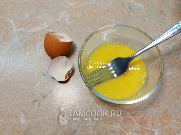 Ввести взбитое яйцо струйкой, интенсивно мешая, чтобы яйцо не успело свернуться. Прогреть ещё около минуты, не переставая мешать, масса загустеет.