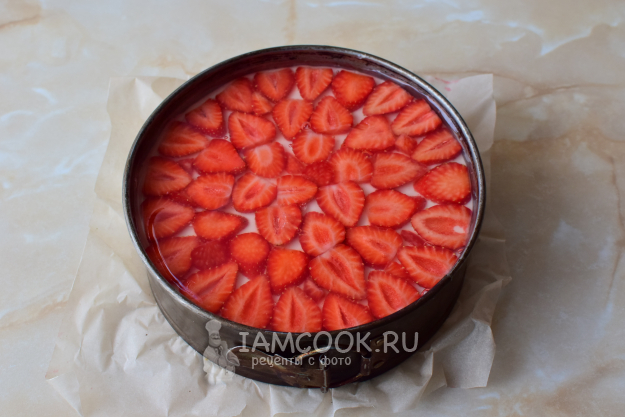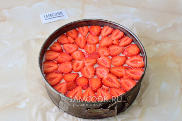 Ягоды клубники помойте, обрежьте хвостики. Нарежьте ягоды и разложите их по застывшему муссу.