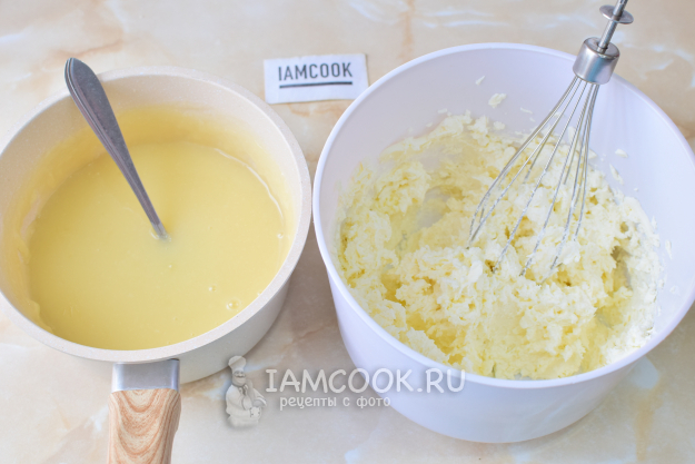 Маскарпоне взбейте, чтобы он стал более воздушным. Предварительно можно его немного подержать на кухне, чтобы он стал мягче. Затем постепенно соединяйте обе массы.