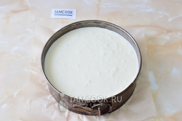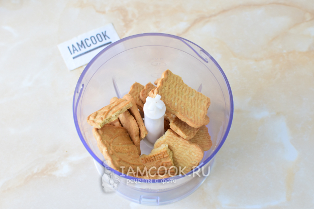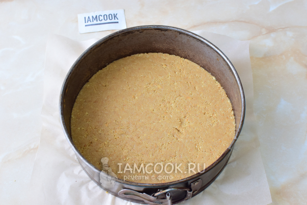 Дно разъемной формы (20-22 см) застелите пергаментом и наденьте кольцо. По дну выложите ровным слоем тесто из печенья и утрамбуйте. Уберите форму в холодильник на полчаса.