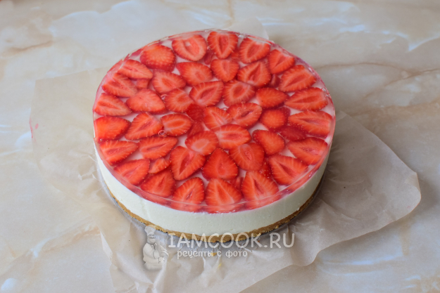 Острым ножом пройдитесь по краю формы и освободите чизкейк с клубникой и маскарпоне от кольца.