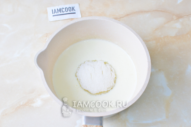 Сливки соедините с сахаром и поставьте на огонь. Доведите до горячего состояния, чтобы сахар успел раствориться.