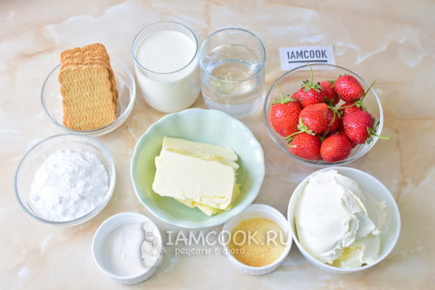 Для приготовления чизкейка с клубникой и маскарпоне без выпечки соберите необходимые ингредиенты по списку. Сливочное масло заранее достаньте из холодильника и оставьте при комнатной температуре, чтобы оно стало мягким.