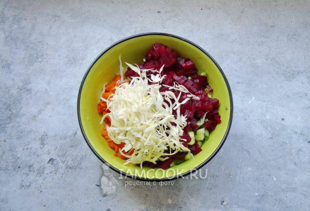 Вареную свеклу охладите, очистите и нарежьте мелкими кубиками. Свежую капусту нарежьте тонкой соломкой и немного пожмите руками.