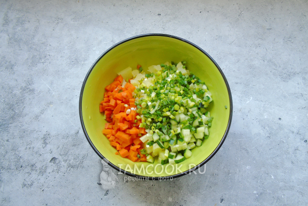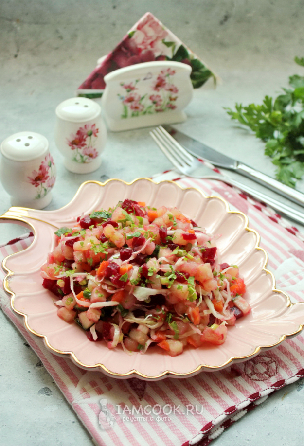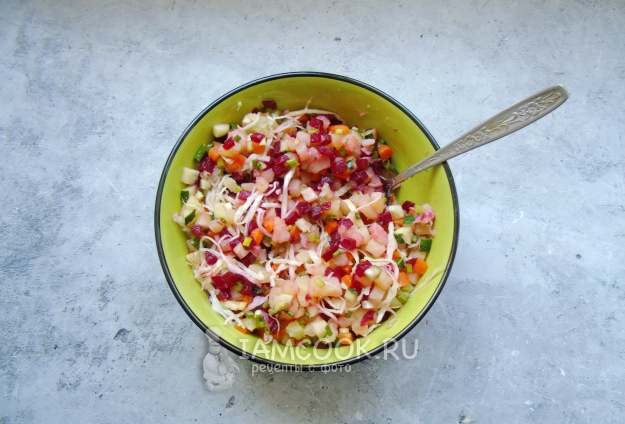 Постный винегрет со свежим огурцом и свежей капустой готов.
