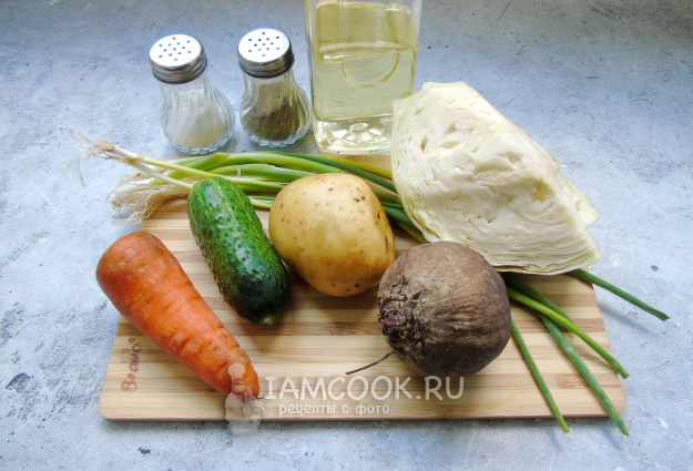 Соберите ингредиенты для приготовления винегрета со свежим огурцом и свежей капустой, которые перед вами - на фото.