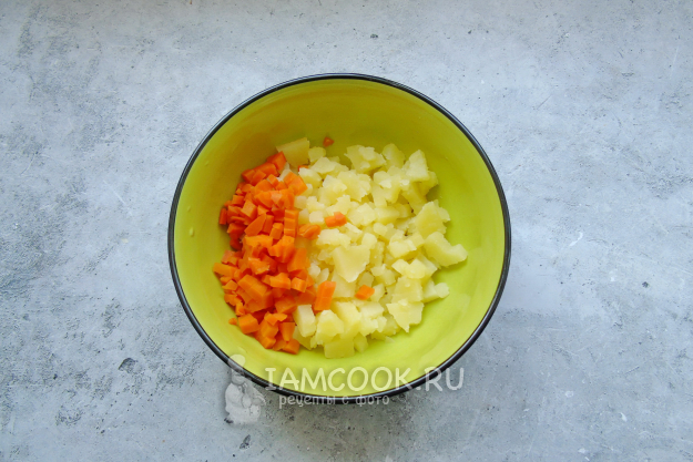 Прежде всего сварите картошку, морковь и свеклу. Если это сделать заранее, то приготовление винегрета займет минут 20-25. Вареную картошку и морковь охладите, очистите и нарежьте мелкими кубиками.