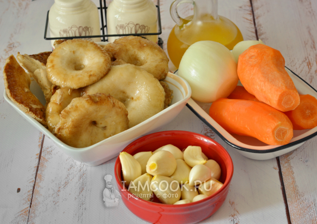 Соберите все продукты по списку для приготовления грибной икры из груздей с морковью и чесноком на зиму. Лук, морковь и чеснок традиционно очистите и сполосните.