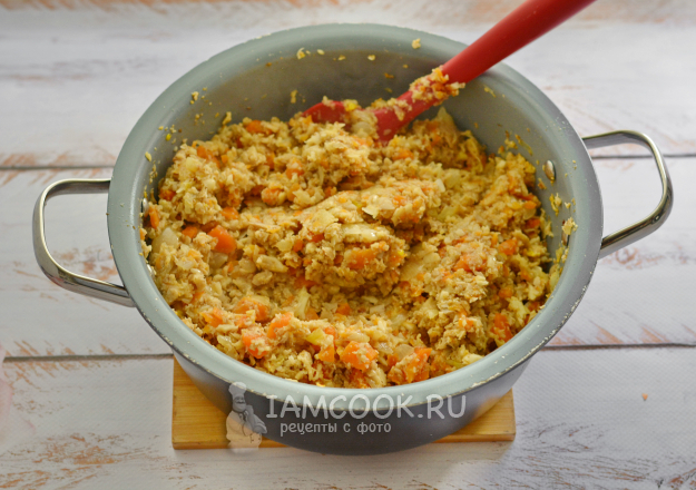 Разогрейте в глубоком сотейнике растительное масло. Обжарьте лук с морковью до золотистого цвета на среднем огне. Постоянно помешивайте овощи, чтобы они не подгорели.