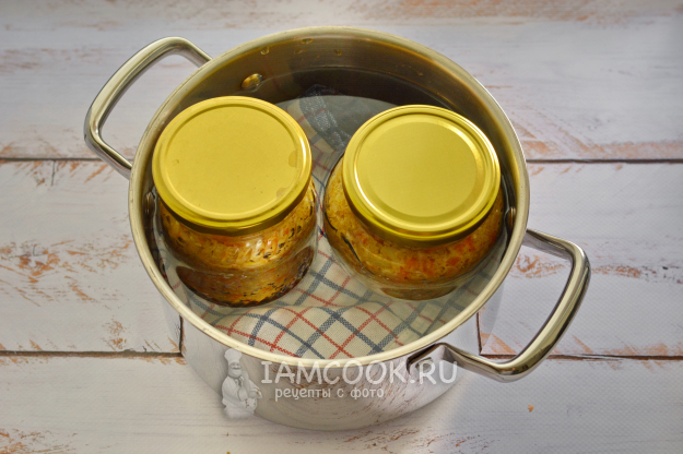 А тем временем тщательно вымойте банки и крышки. Разложите готовую икру из груздей по баночкам, прикройте крышками и поставьте стерилизоваться в кастрюльку.