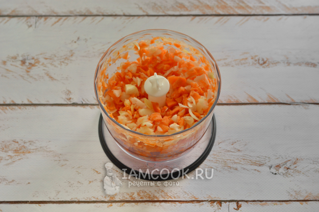 Лук и морковь мелко нарежьте или измельчите блендером в пульсовом режиме на средние куски.