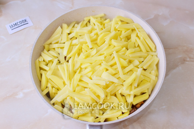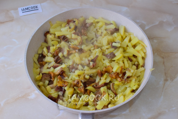 Выложите картошку к грибам. Перемешайте. По вкусу добавьте соль и немного специй. Очень ароматные специи не используйте, так как они могут перебить аромат грибов.
