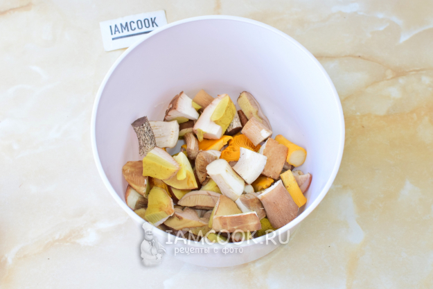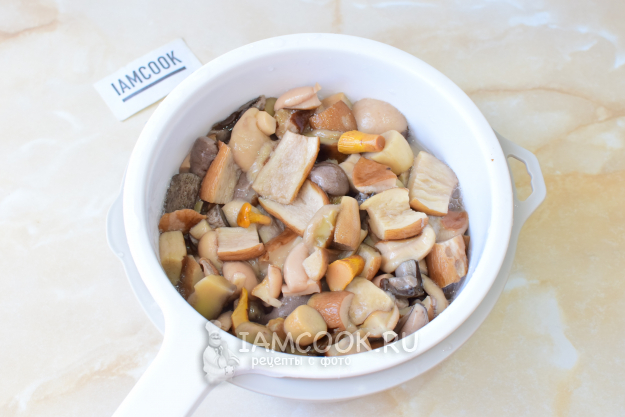 Очистите грибы от загрязнений и нарежьте на кусочки. Сильно мелко не режьте, так как они уменьшатся за время приготовления. Промойте их несколько раз в холодной воде. Затем отварите в течение 20-25 минут. Снимайте всю пену, которая будет образовываться.
