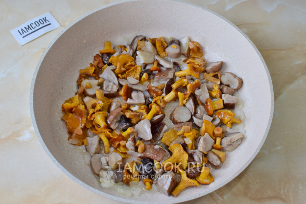 Переложите к луку вареные грибы. Перемешайте. Жарьте грибы с луком 2-4 минуты, чтобы они хорошо прогрелись.