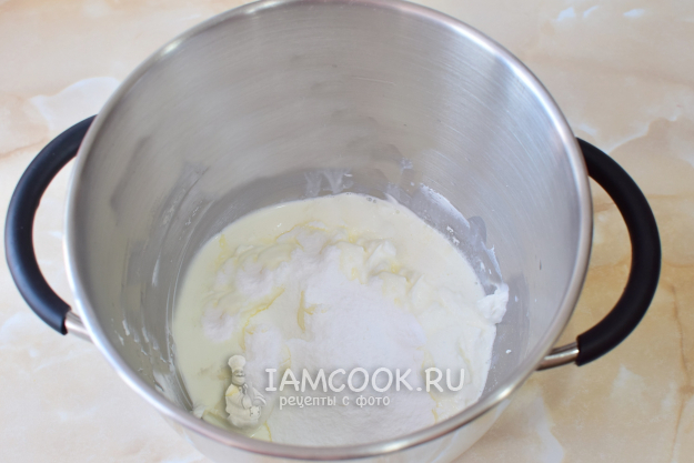 Для приготовления бисквита соедините яйца с сахаром и взбейте их на максимальной мощности миксера до пышной густой массы.