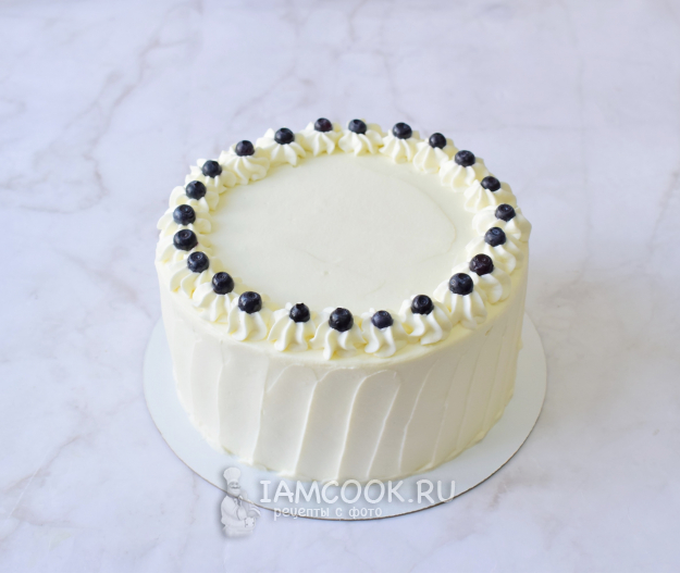 Для внешнего выравнивания также взбейте сливки, сыр и сахарную пудру и оформите декор торта. Можно украсить свежими ягодами черники.