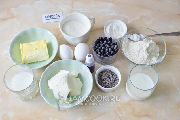 Для приготовления лавандового торта с черникой соберите все ингредиенты по списку. Ягоды черники могут быть как свежими, так и замороженными.