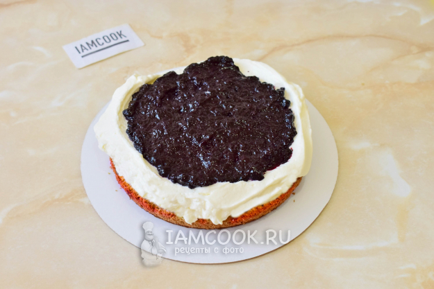 Коржи можно пропитать лавандовым сиропом, сахарным сиропом или просто водой. На пропитанный бисквит выложите крем, формируя небольшие бортики, а в центр - черничную начинку.