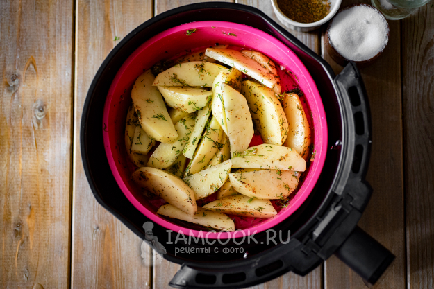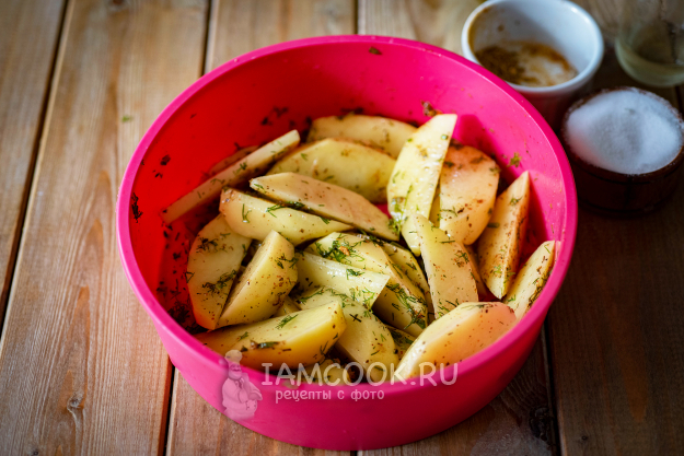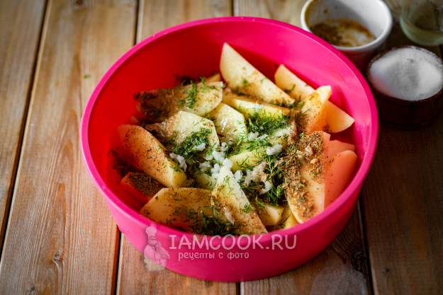 В силиконовую форму выложим все картофельные дольки, выдавим к ним через чеснокодавилку чеснок, добавим измельченный укроп, соль, специи для картофеля, зальем растительное масло.