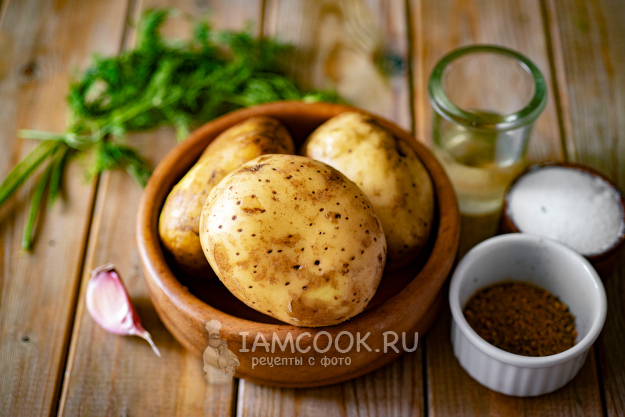 Соберём необходимые ингредиенты для приготовления молодой картошки в аэрогриле. Картофель почистим и помоем. Чеснок почистим. Укроп ополоснем в проточной воде.