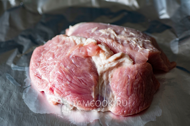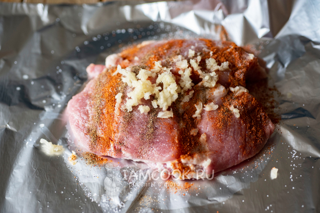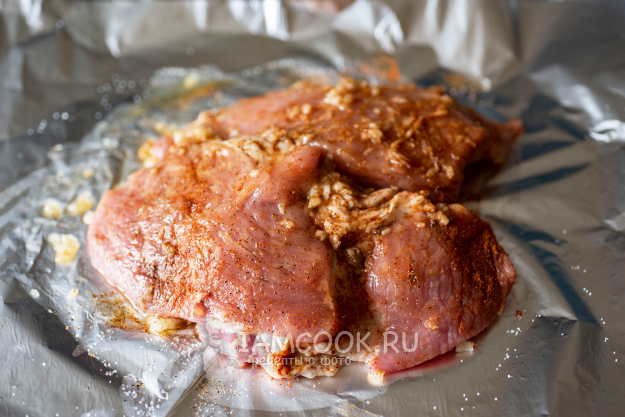 Все эти ингредиенты хорошенько вотрем в свинину. Края фольги поднимем и руками закрепим по возможности плотно.