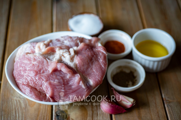 Соберём необходимые ингредиенты для приготовления свинины в фольге в аэрогриле. Свинину ополоснем в проточной воде и просушим бумажными полотенцами. Чеснок почистим.