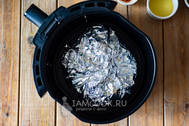 Свинину в фольге выложим в чашу аэрогриля и установим ее на место. Установим температуру запекания в 200 градусов и будем запекать свинину в фольге в аэрогриле 15 минут. Затем, после сигнала об окончании процесса, установим температуру в 150 градусов и время запекания - 1 час.