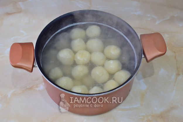 В кастрюле закипятите воду и немного подсолите. В кипящую воду опустите творожные шарики. Варите их 1-2 минуты после всплытия.
