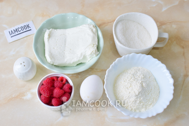 Чтобы сделать ленивые вареники с малиной внутри, подготовьте все ингредиенты по списку. Творог берите не очень влажный, чтобы в тесто не добавлять лишнюю муку.