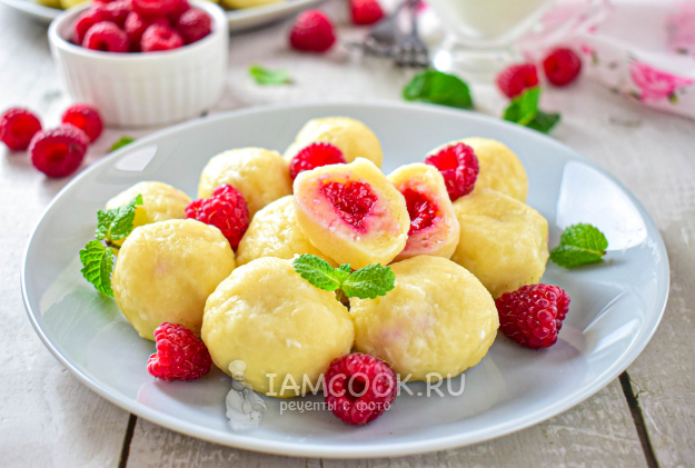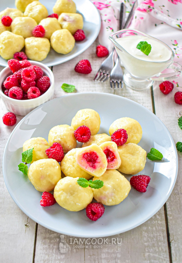 Готовые ленивые вареники с малиной внутри выложите на тарелки и подавайте к столу в горячем виде. Дополнить можно сметаной или ягодным соусом.