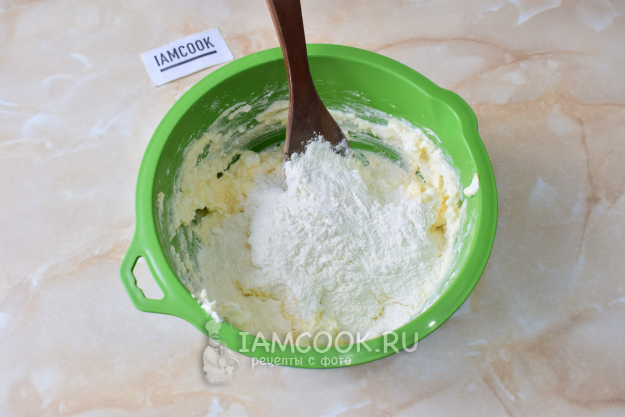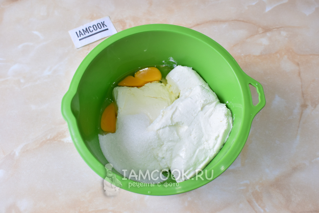 Для приготовления творожного теста разбейте в чашу яйцо и добавьте творог. Подсыпьте сахар и щепотку соли. Смешайте. Не стоит для смешивания брать миксер. Он сделает тесто жидким.