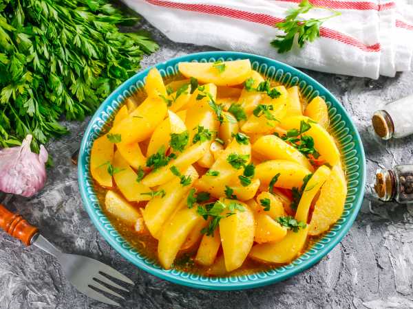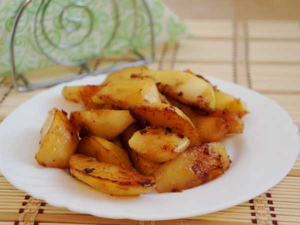 Готовность определяйте, проткнув кусочек ножом - картошка должна быть мягкой. Если вдруг после 5 минут приготовления картошка твердовата (зависит от сорта), то прибавьте еще минуту или две на готовку. Но лучше это делать постепенно (по одной минутке), иначе картошка может начать взрываться.