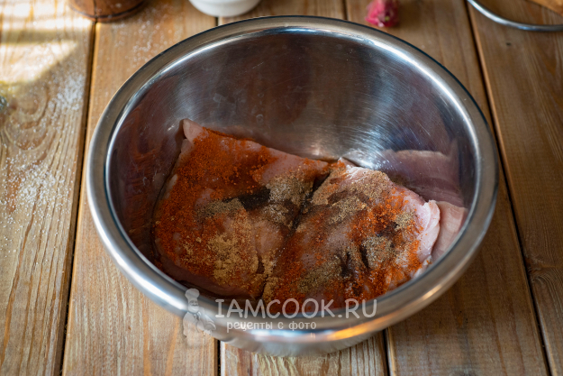 Все специи и чеснок вотрем в стейки индейки и оставим миску со стейками на полке холодильника на 1 час.